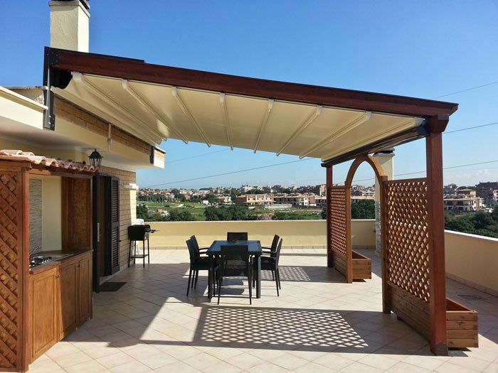 Pergola&Tenda è una copertura con struttura in legno o alluminio da installare nel vostro giardino o terrazzo e trasformare questa zona outdoor in un angolo relax da godersi al coperto. Oppure potete optare per creare una zona chiusa anche sui lati perimetrali. In base alle vostre esigenze potete scegliere fra una vasta gamma di modelli proposti; la struttura può essere del tipo autoportante o ancorata alla parete, realizzata col tetto inclinato, in piano o, in base alla all'architettura del locale in cui posizionare la tenda ad incastro e realizzata su misura.