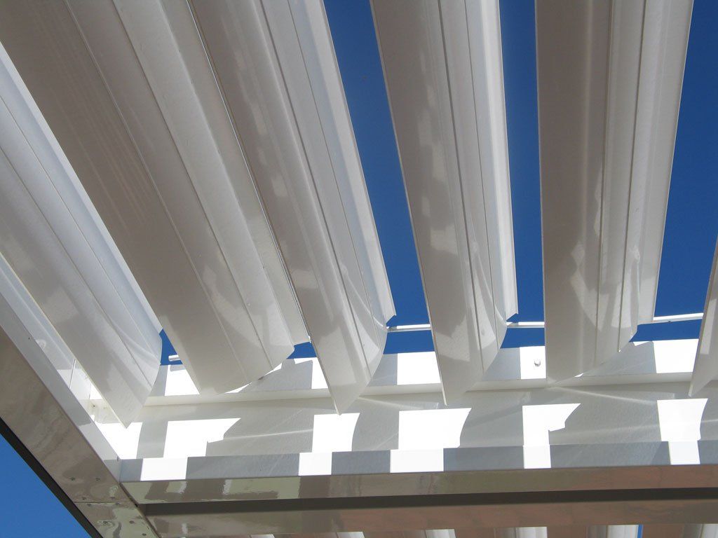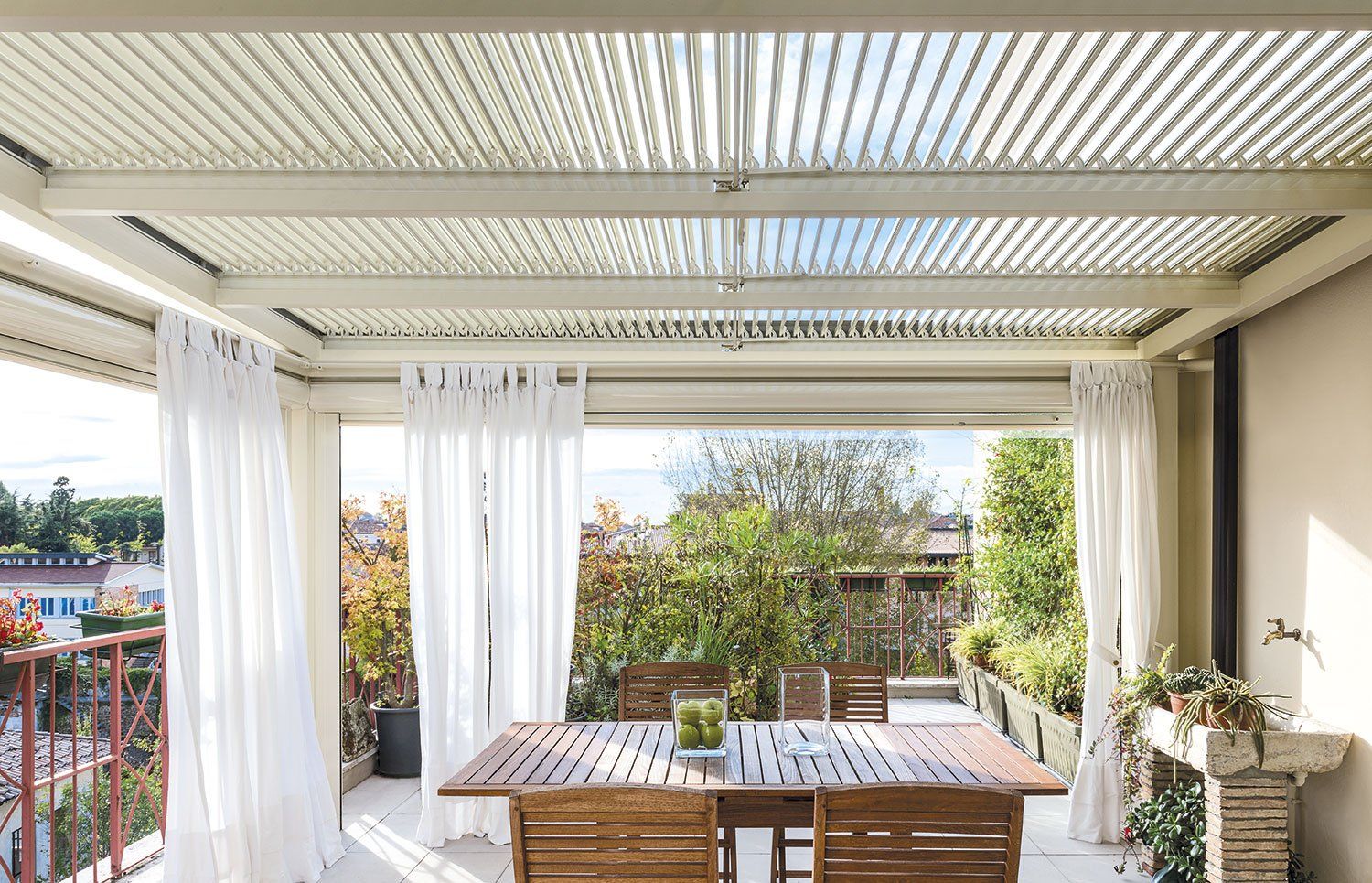 Il vantaggio è quello di poter scegliere l’angolazione delle lame preferita, in modo da schermare efficacemente lo spazio esterno dai raggi del sole e anche dal vento. Quando piove, le lame si chiudono completamente, incastrandosi tra loro con una pendenza di alcuni millimetri, che permette all’acqua piovana di defluire.